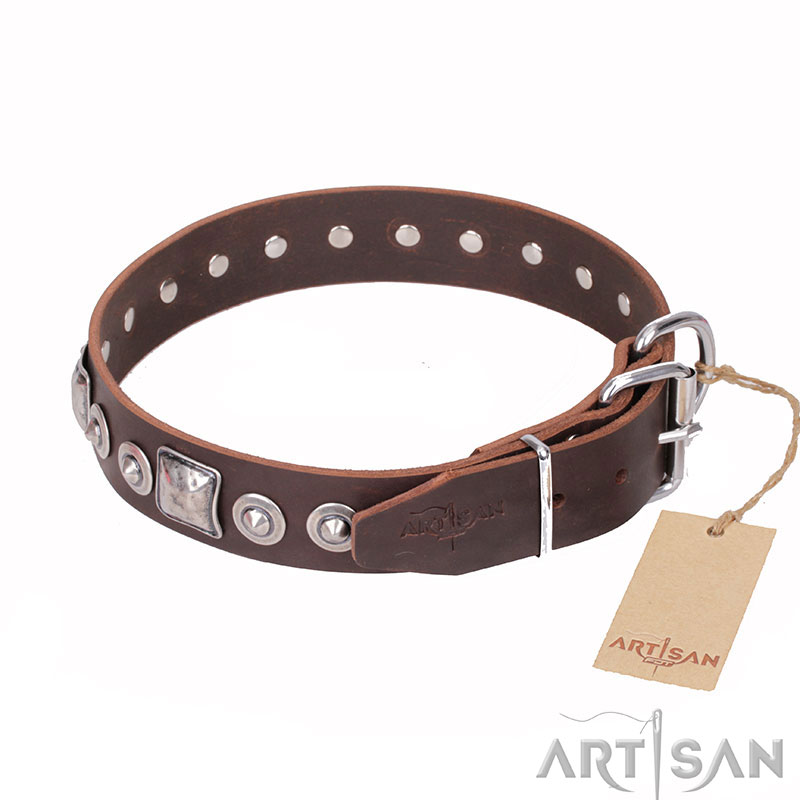 Brown Leather Artisan Dog Collar with Chrome-plated Hardware