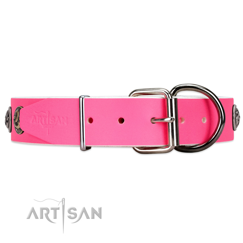 FDT Artisan pink leather dog collar! It is so stylish and girlish! Round gold- and silver-like studs shine bright like real jewelry. With this collar on your four-legged lady will be in the center of admiration. This fashionable collar