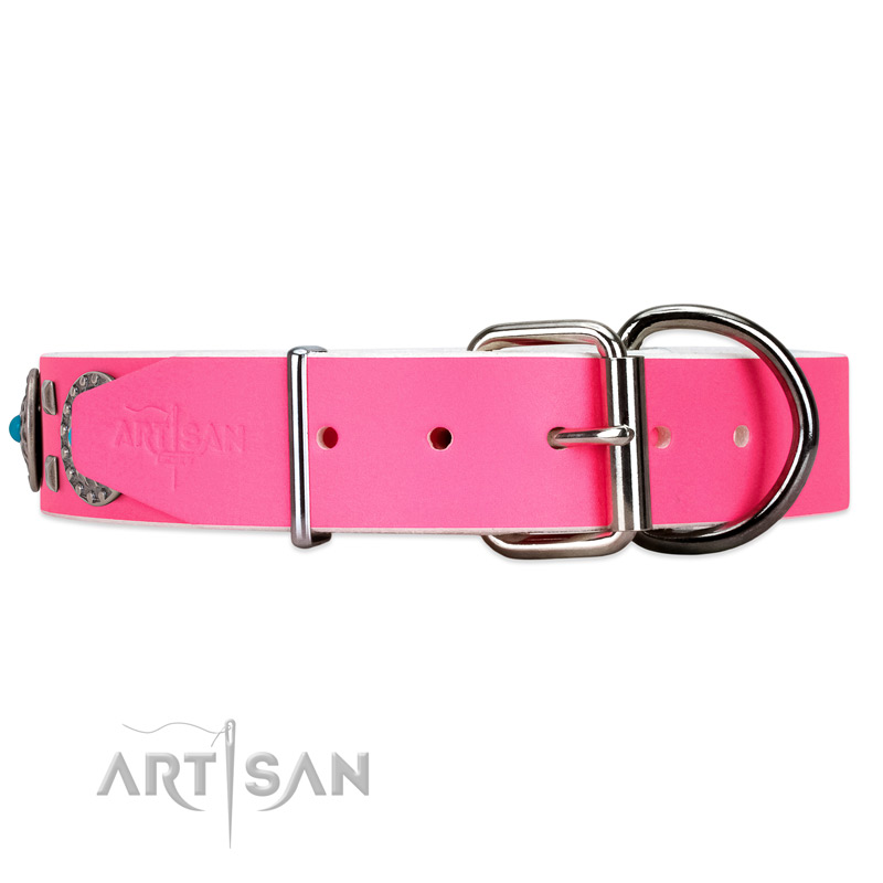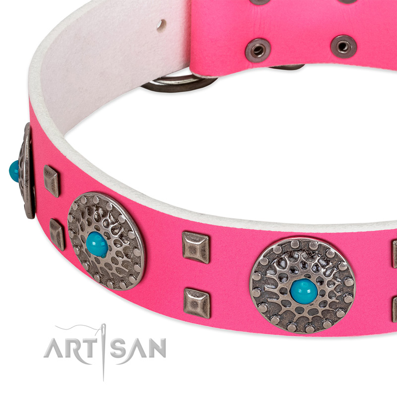 Pink leather dog collar delivers pleasant emotions