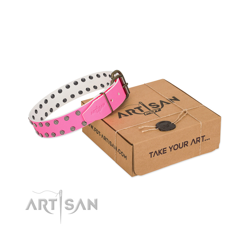 It’s very pleasant to see a good-looking dog walking on the streets, isn’t it? It shows dog owner's great love and care. Elegant design, reasonable price and unbeatable quality are combined together in one tool – handmade FDT Artisan pink leather dog collar. Buy this fashionable gear and everyone will admire your pet and you!