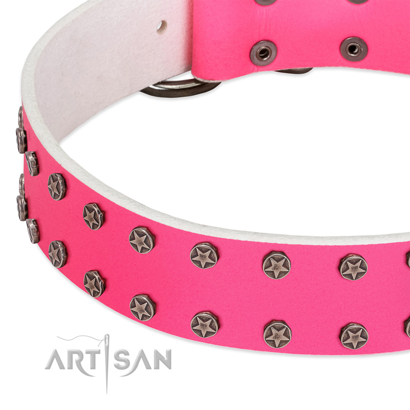 Do you keep an eye on the latest trends? Then get this bright pink leather dog collar and let your canine feel like a fashion-monger. This collar is handmade and decorated by our craftsmen. There are two rows of silver-like round studs with engraved stars. It is made of selected genuine leather with smoothed and polished edges.