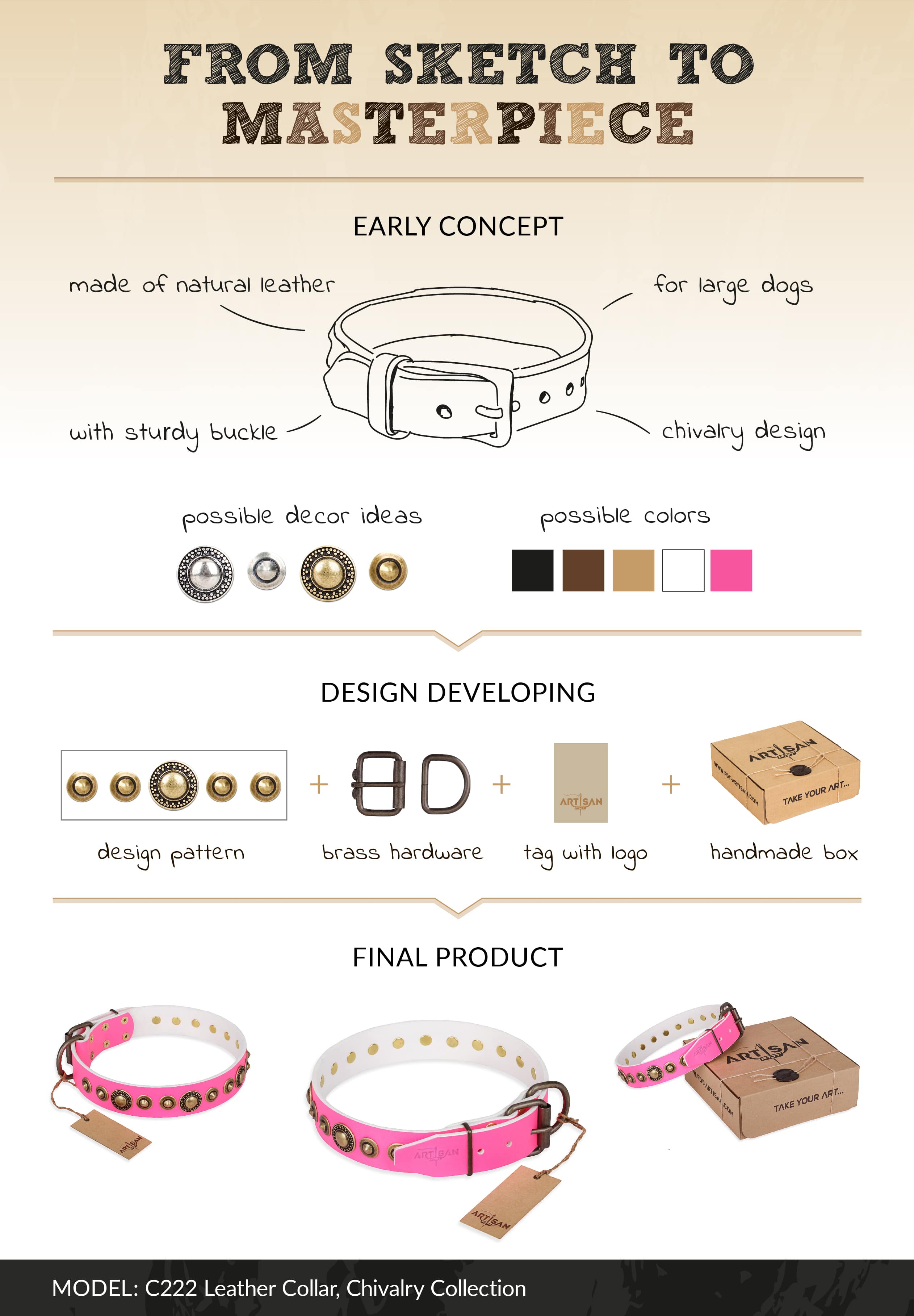 Chivalry Style Decorated Pink Leather Dog Collar with Brass Plated Hardware