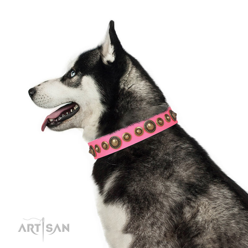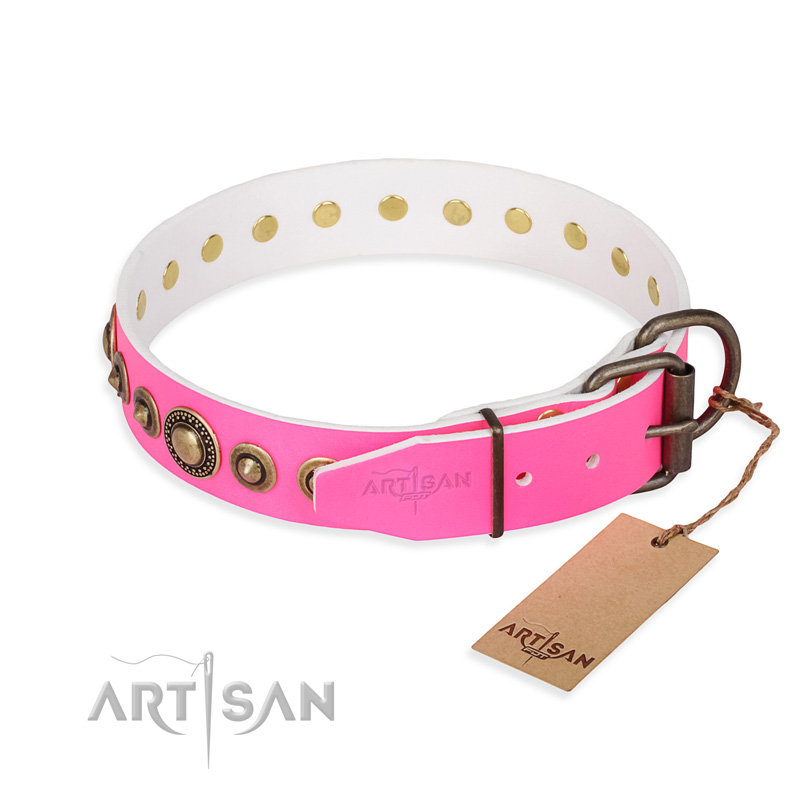 Here is a decision! This luxury style dog collar made of pink dyed leather is one of the most amazing things available on the market of canine equipment. Securely riveted old-bronze plated studs and circles shine brightly in the sun, attracting extra attention to your beloved pet. Have no worries about the quality of the supply. Soft genuine leather is gentle to the skin and will never cause rubbing or irritation. This is a fine walking dog collar, decorated with fashionable adornment, totally safe and dog-friendly. Your she-dog will love wearing it, especially when she receives compliments from passers-by.