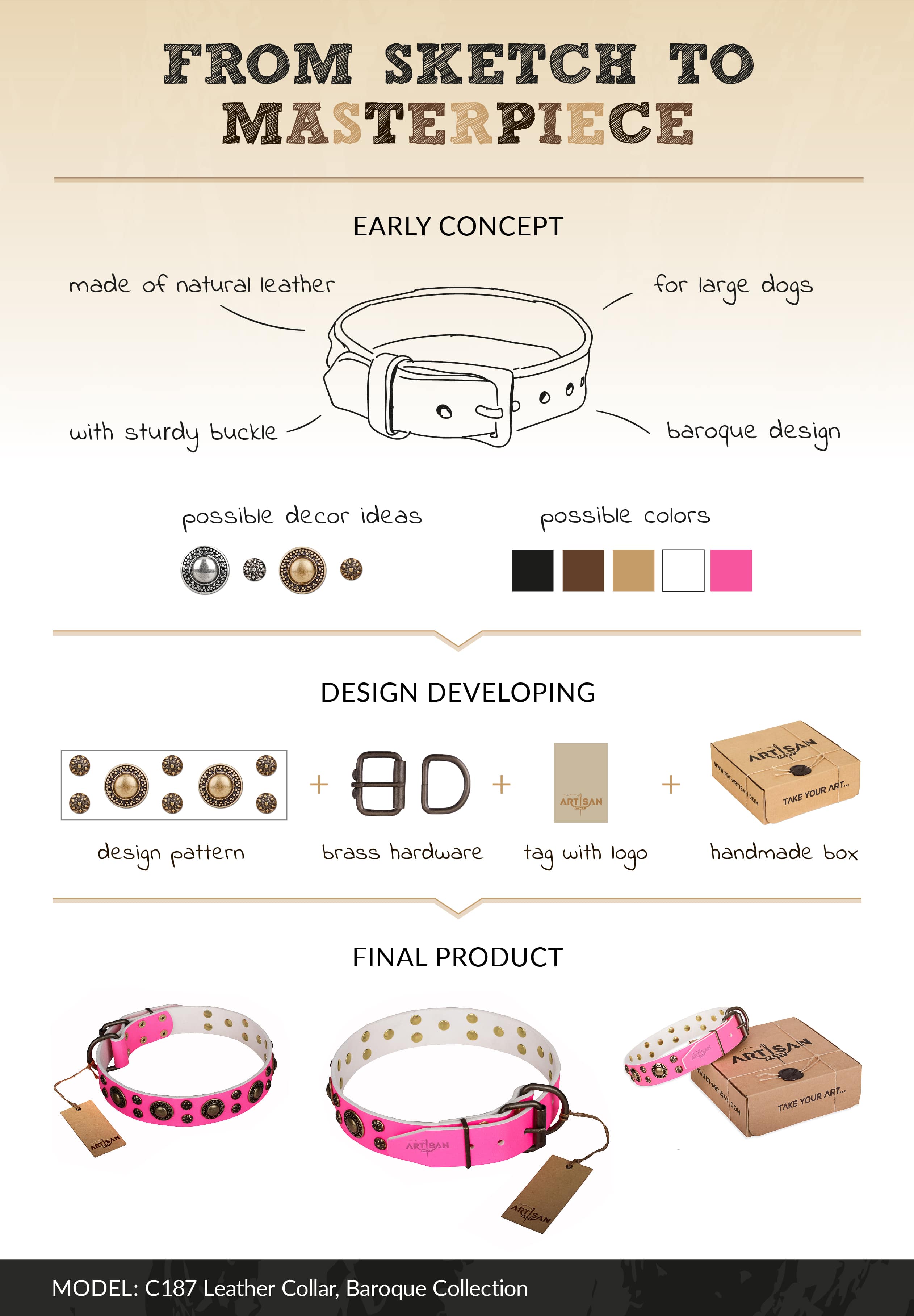 Baroque Collection Handmade Pink Leather Dog Collar with Studs