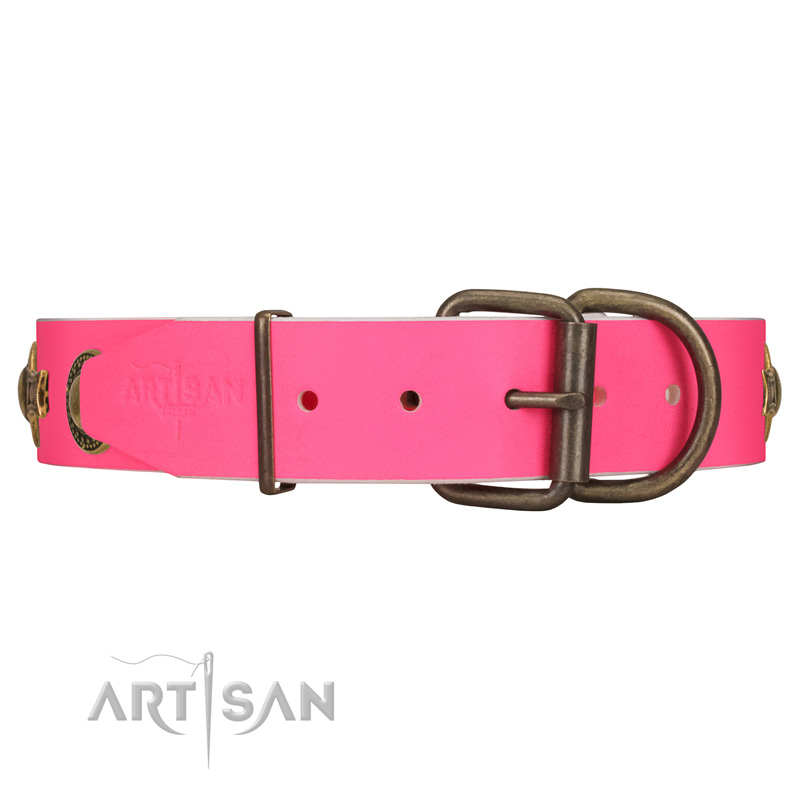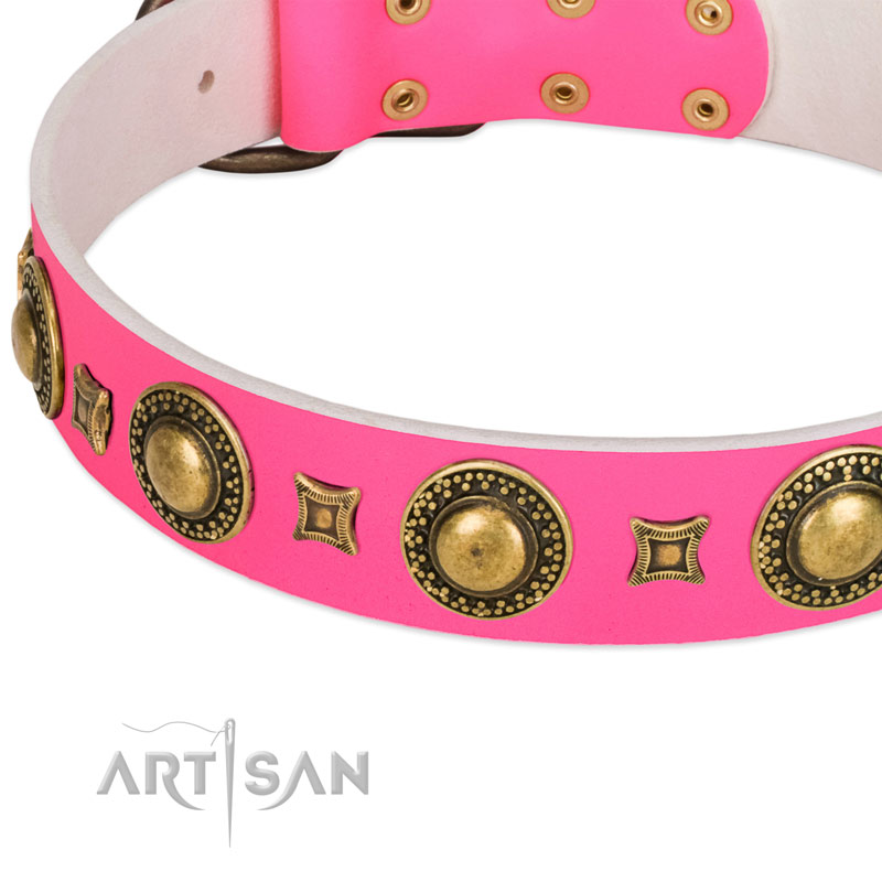 Pink stylish leather dog collar delivers pleasant emotions