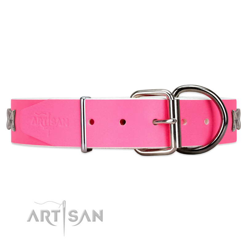 will serve you a long time. Chrome-plated steel hardware is rustproof and adds extraordinary beauty to the collar. This leather dog collar is stylish, fashionable, and comfortable. In addition, this FDT Artisan Pink Leather Dog Collar is easily adjustable, serviceable and functional. It is hard to find all these demandable qualities in any another dog collar. This amazing