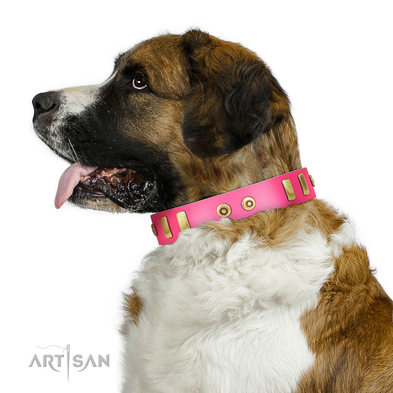 Order this elegant handmade collar now and get secure dog handling and stylish look of your dog. Gorgeous design and high durability are combined together into a gorgeous dog accessory. This trendy bright pink collar was created for your dog
