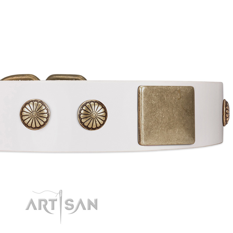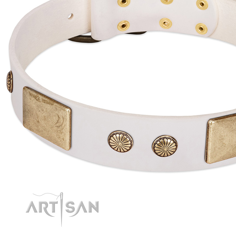 Decorated White Leather FDT Artisan Dog Collar for Maximum Comfort