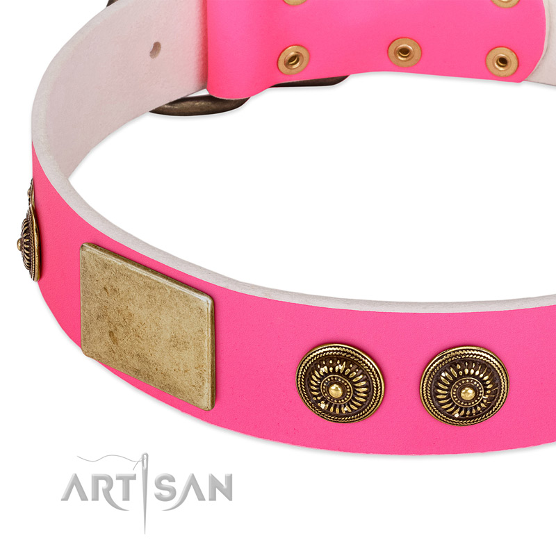 Deluxe Pink Leather Dog Collar Decorated with Antiqued Plates