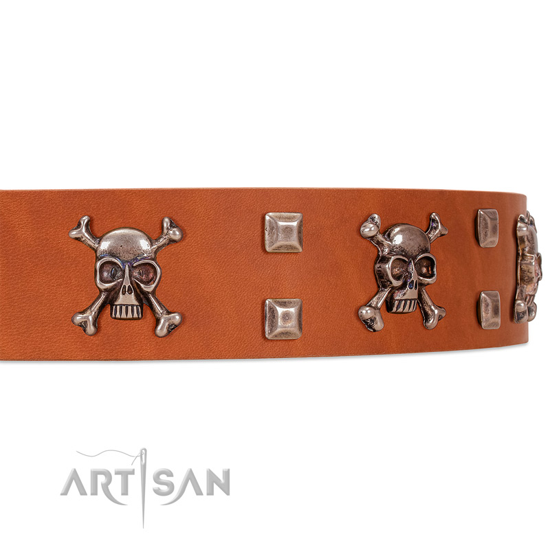 FDT Artisan offers this tan leather dog collar adorned with a set of skulls with crossbones and small square studs. Your pooch will look his/her best when wearing this tremendous pet accessory. Forget about low-quality and one-time pieces of dog equipment once and for all! Get what your pooch deserves! And he/she deserves only the best!