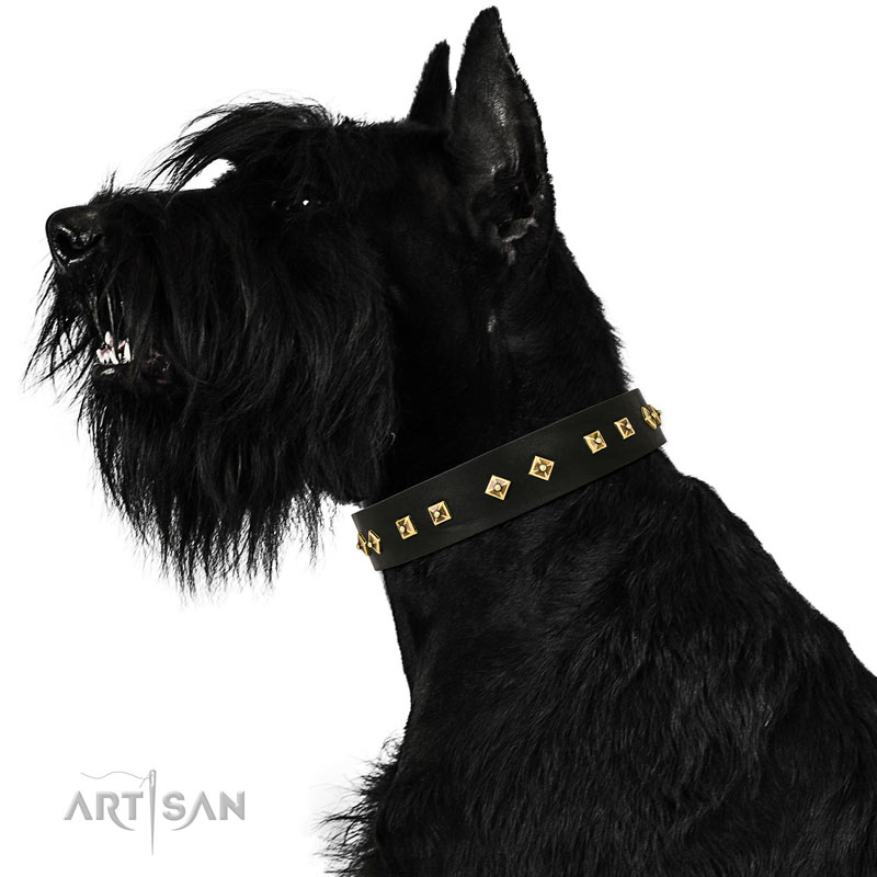 Reisenschnauzer easy to adjust natural genuine leather dog collar with adornments