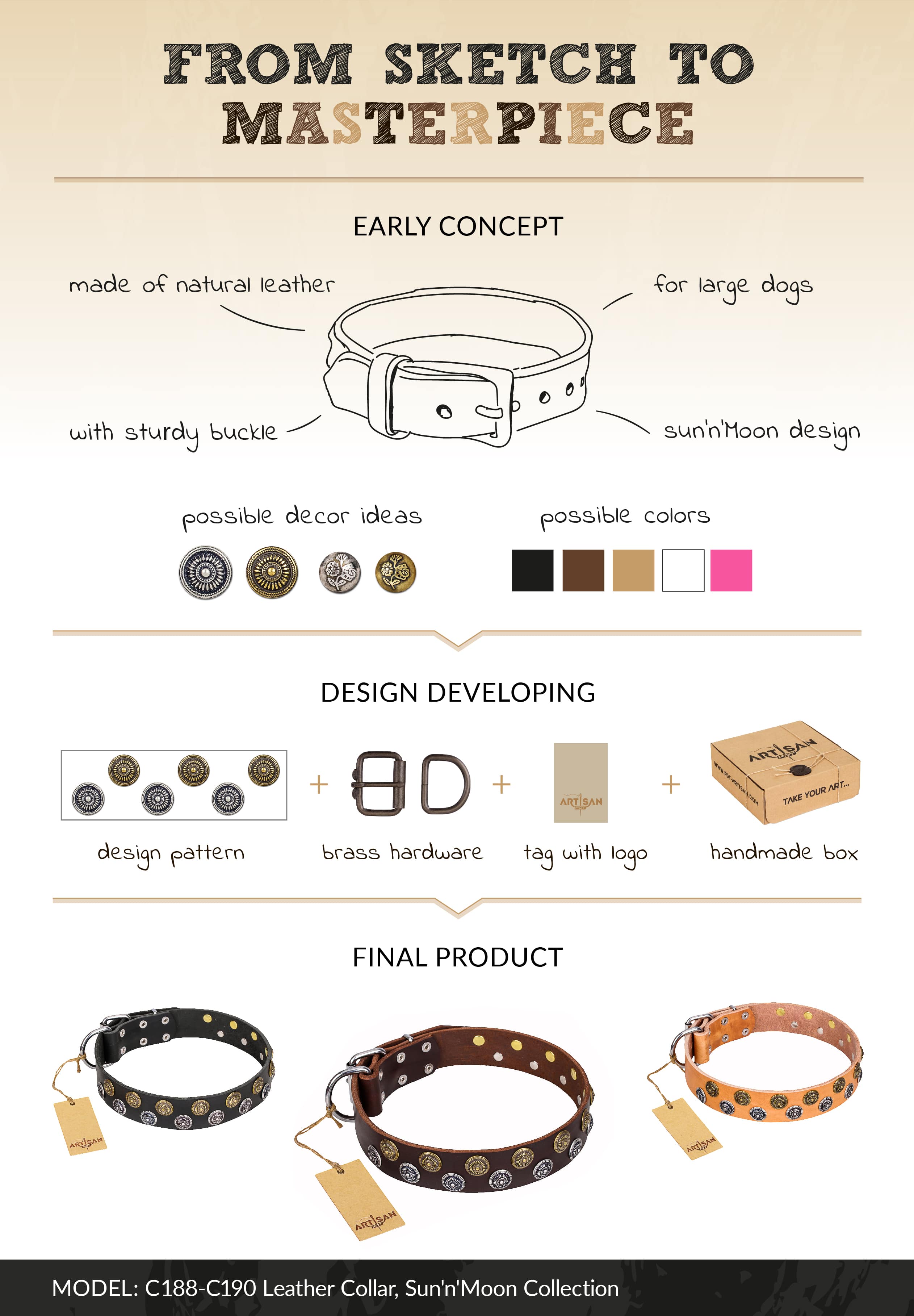 creates inimitable ensemble and unforgettable impression. This wonderful leather collar will become in handy for walking and basic training of your beloved doggie. Hurry up to order this exquisite leather dog collar with decorations!