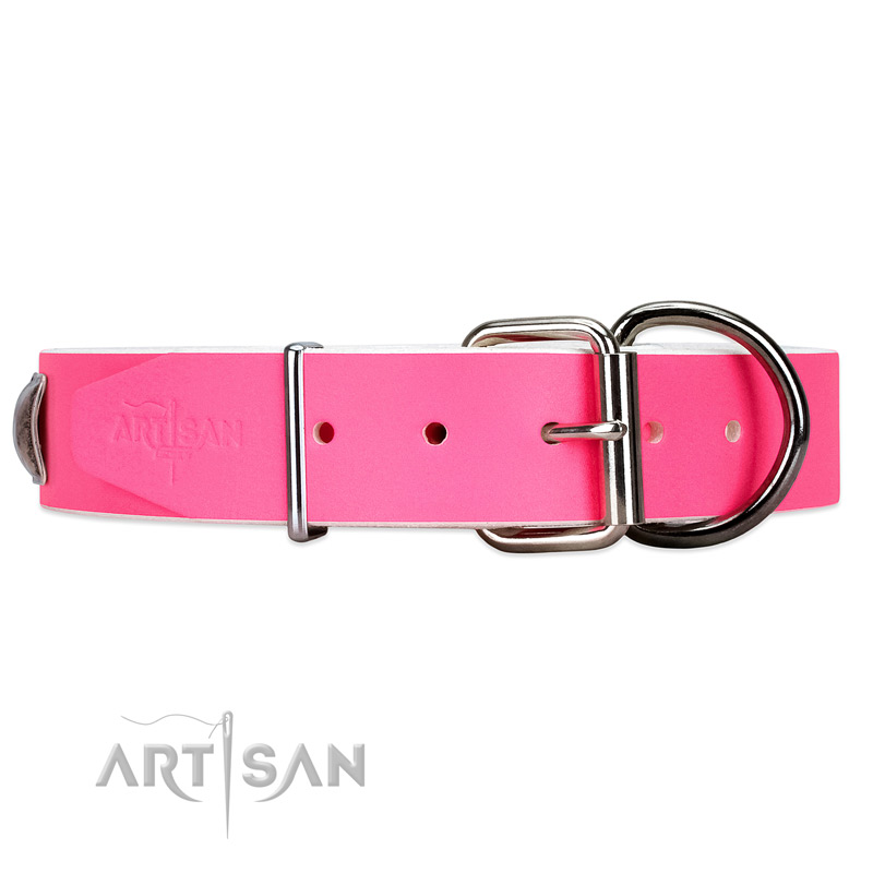 designer pink leather collar is made specially for such loving pet owners who care about comfort and look of their pets. This amazing