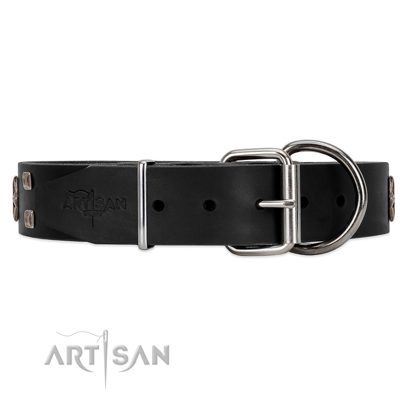 Handcrafted black leather dog collar is an exclusive outfit