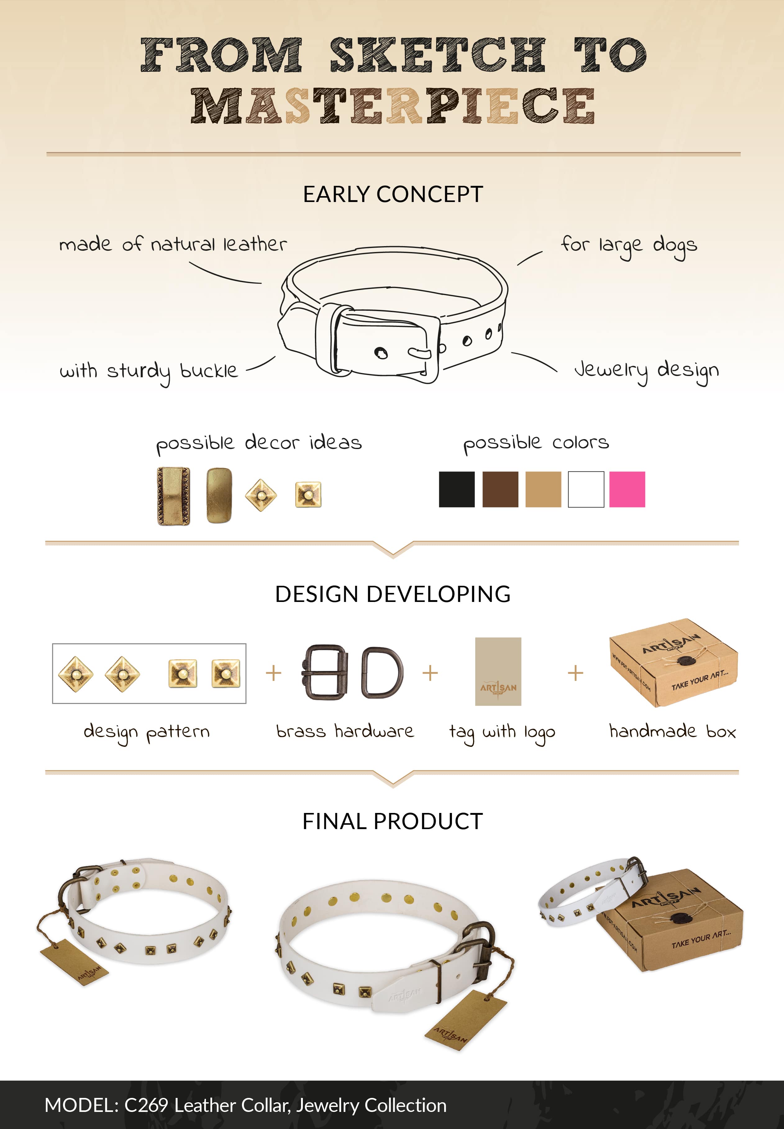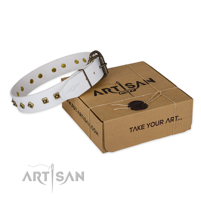 makes every minute of wearing pleasant and comfortable for your pet. This strong tool is made of superior genuine leather and decorated with luxurious adornments for stylish look of your pet. So, it is obvious that this white leather collar is an efficient walking tool as well as beautiful and trendy decoration. Keep up and order this functional white leather dog collar for your extravagant canine!