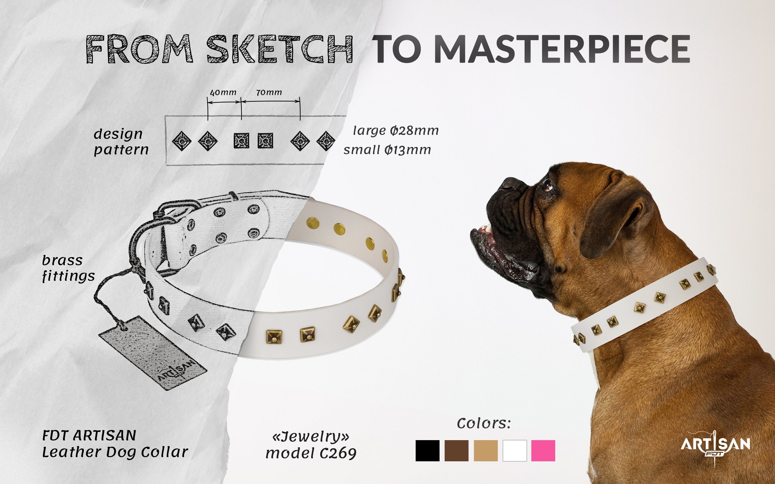 Jewelry Style Decorated White Leather Dog Collar with Brass Plated Hardware