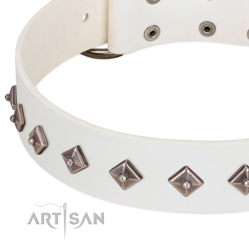 FDT Artisan white leather collar! This accessory is presented in delicate design with magnificent decorations. Durability is provided with premium qualities of the materials applied. Genuine leather strap, chrome plated steel hardware and silver-like plated pyramids are safe and hypoallergenic.