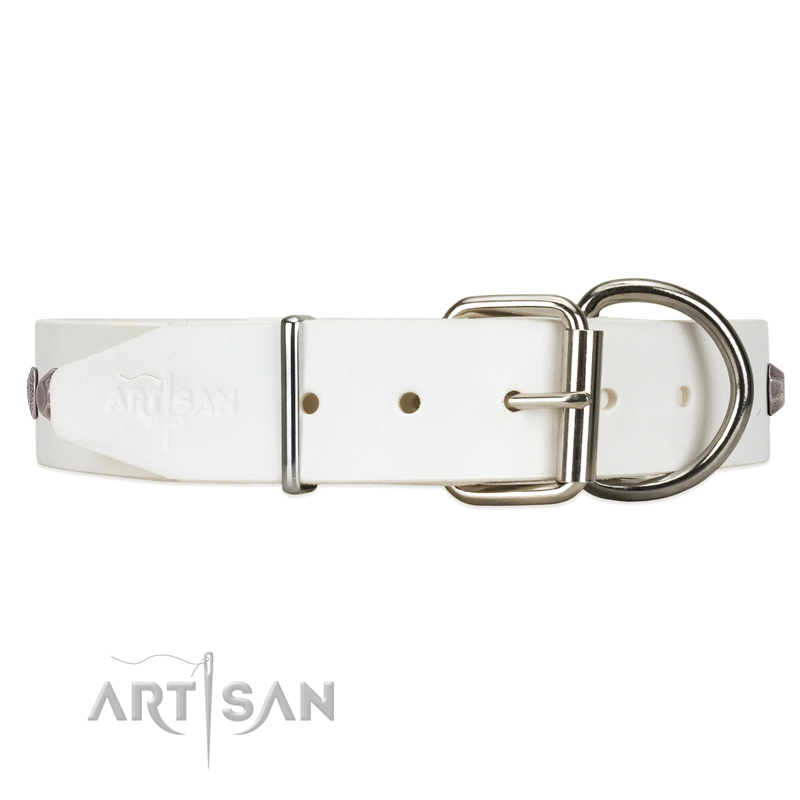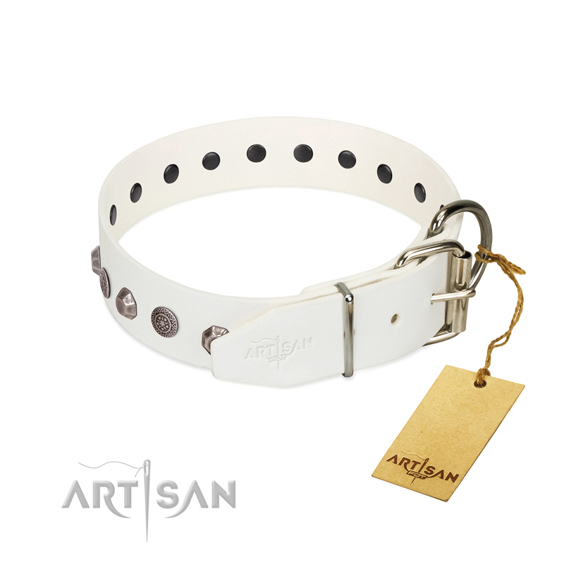 Your dog must look irresistible any time! How can you do this? Very easy! Just order this FDT Artisan White Leather Collar - your dog is a superstar without efforts. It is crafted of genuine full grain leather, equipped with rust-proof secure hardware and adorned with fancy brooches to create a product of premium quality to satisfy you and your furry companion for 100%.