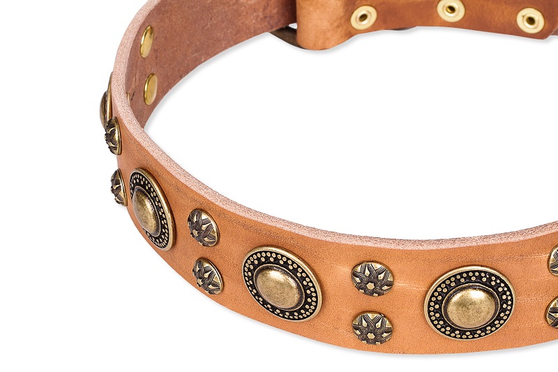 Tan Leather Dog Collar with Old Bronze Look Decorations