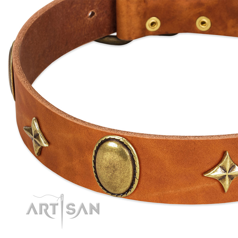 Riveted ovals and stars on marvelous Artisan tan leather dog collar