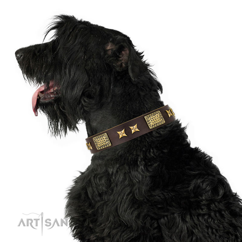 Black Russian Terrier impressive full grain natural leather dog collar with embellishments