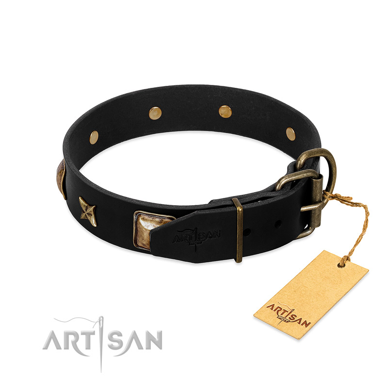 Do you want to handle your dog in fashion? It is high time to get rid of your dog's old collar and order a new one from an exclusive FDT Artisan collection! This Black Leather Dog Collar with Antiqued Embellishments is the ideal variant for daily use, as it combines matchless design and superior quality. Made of 100% genuine soft leather, which brings your pet comfort and nothing but comfort, the collar is also extra strong, durable and reliable. The selected material makes the collar a first-class accessory for safe and, what is not less important, fashionable walking around. Don't you agree that this collar looks like a piece of art? An unusual but stylish blend of plates and stars indicate your dog's personal style.