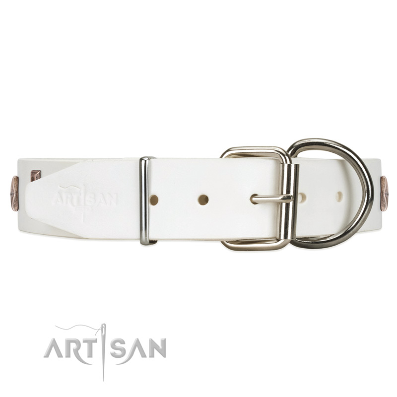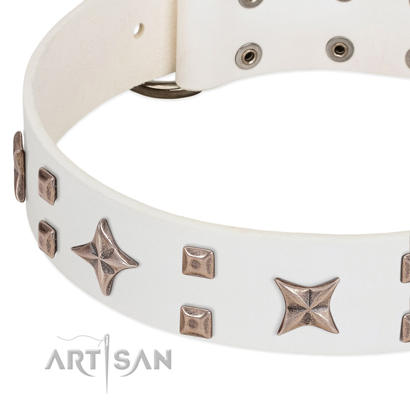FDT Artisan snow-white leather dog collar! It will emphasize the nobility of your canine perfectly. The accessory is presented with stunning decorations of silver color which are set reliably on the leather strap. If you choose this excellent gear, you will get extreme softness, flexibility, and strength. With such premium qualities, this FDT Artisan white studded leather collar will last long. Take a pause and make your order now! Be unique with this