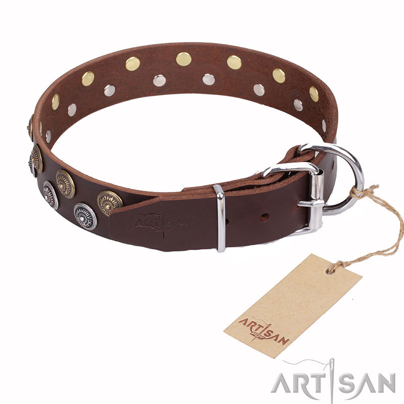 This dog collar is an ideal variant for those, who are searching for a comfortable and exclusive equipment for his beloved friend. It is produced of high-quality materials that provide the collar with long-lasting service and practicalness. Professional craftsmen use specially selected 100% full grain genuine leather for the creation of this wonderful dog gear. This type of leather will surely amaze you with its durability and reliability. It doesn’t rub or irritate your pet's skin. Also, this collar is absolutely safe for the dog's health as it doesn't contain any harmful chemical substances. Use it for everyday walking or training your canine obedience.