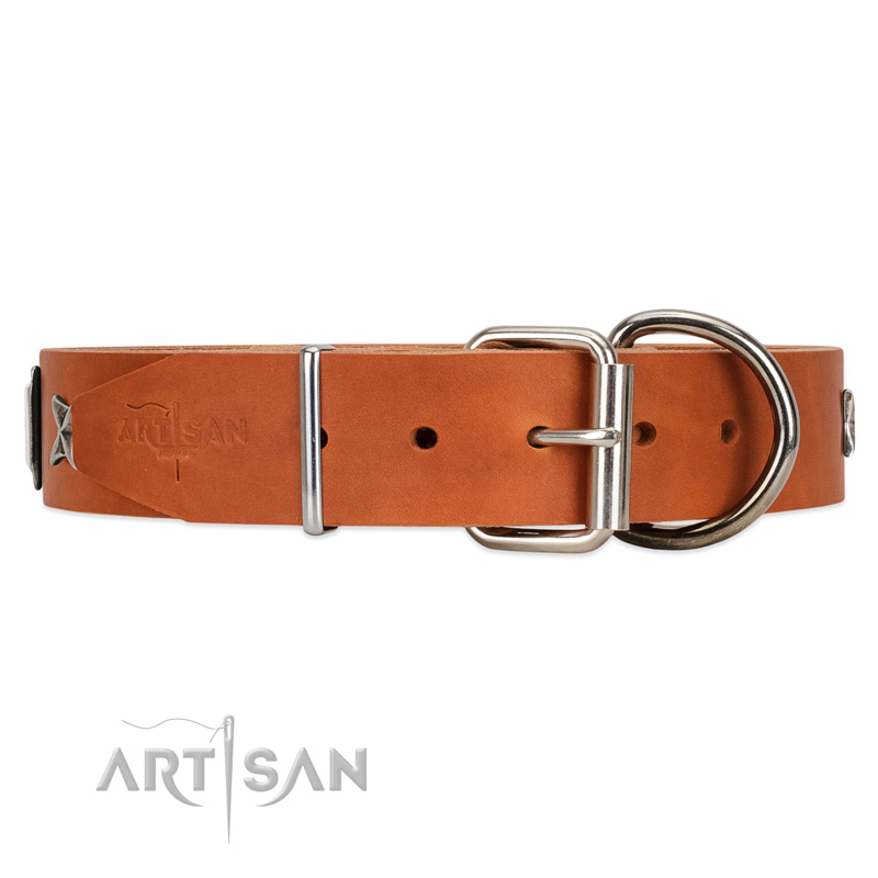 Outstanding design is that very aspect that makes the gear extraordinary and unique. Every detail proves your flawless taste and underlines your dog's nobility! It is adorned with massive square plates and stars of silver-like color. Chrome plated adornments are riveted to the leather strap and will stay put forever. Your dog is free to do everything he wants – the decorations won’t fall off or get rusted.