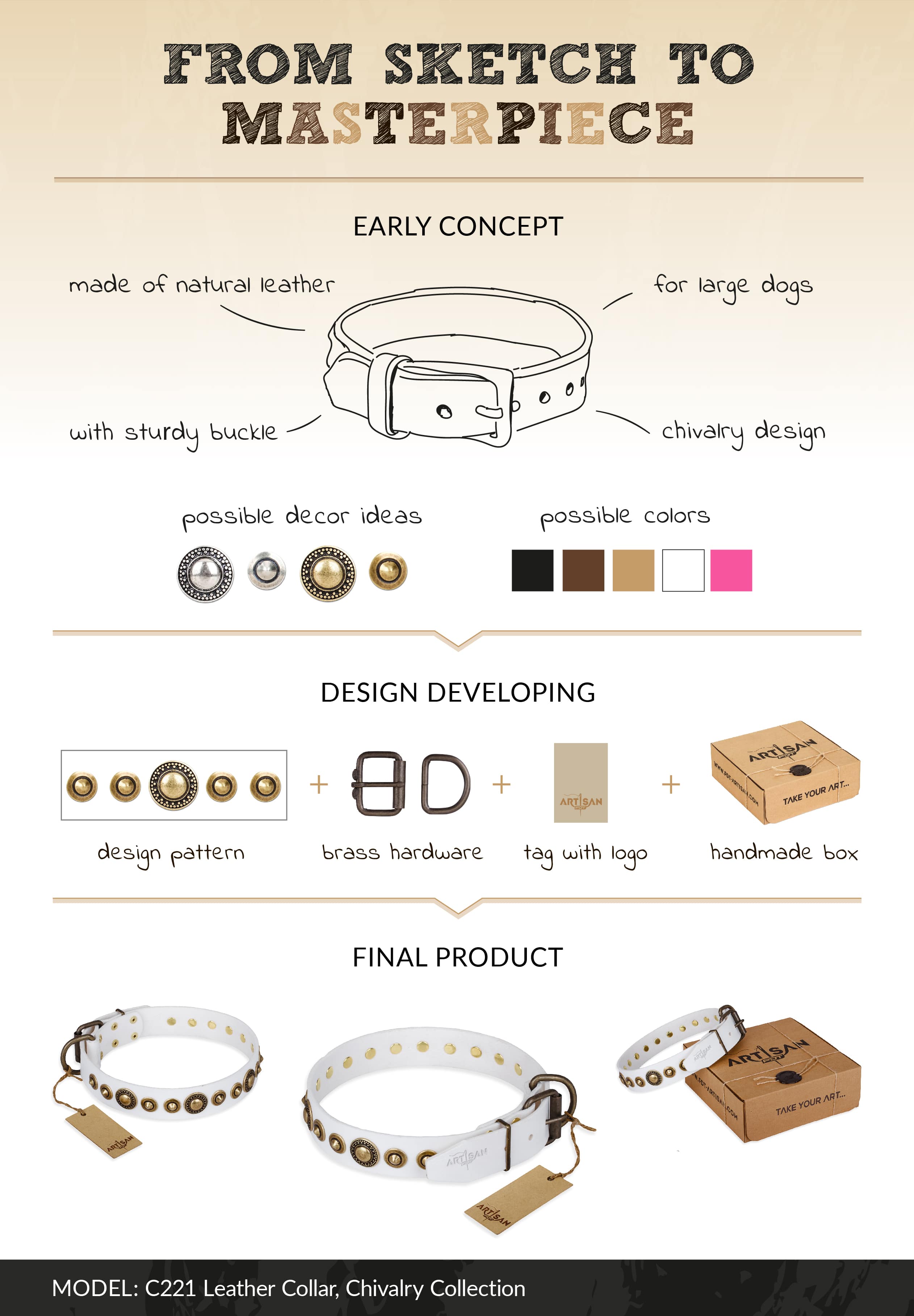 Chivalry Style Decorated White Leather Dog Collar with Brass Plated Hardware