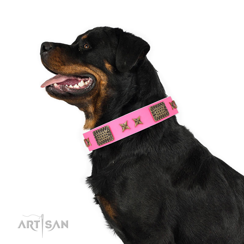 Rottweiler handmade full grain natural leather dog collar with decorations