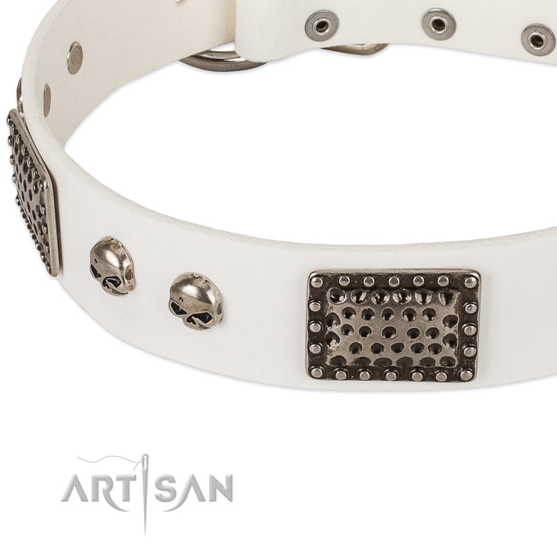 FDT Artisan Sophisticated White Leather Dog Collar with Plates and Skulls 1 1/2 inch (40 mm) wide