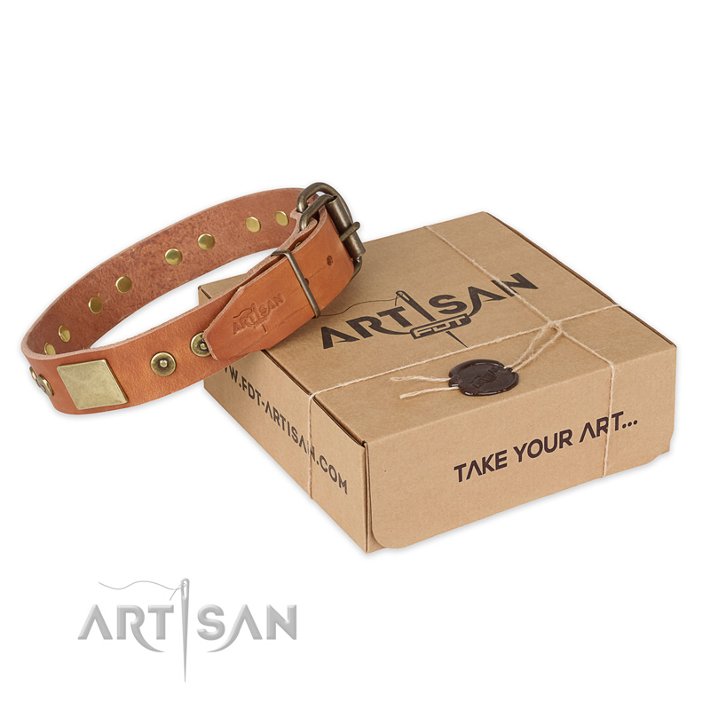 FDT Artisan Delightful Tan Leather Dog Collar with Golden-like Decorations