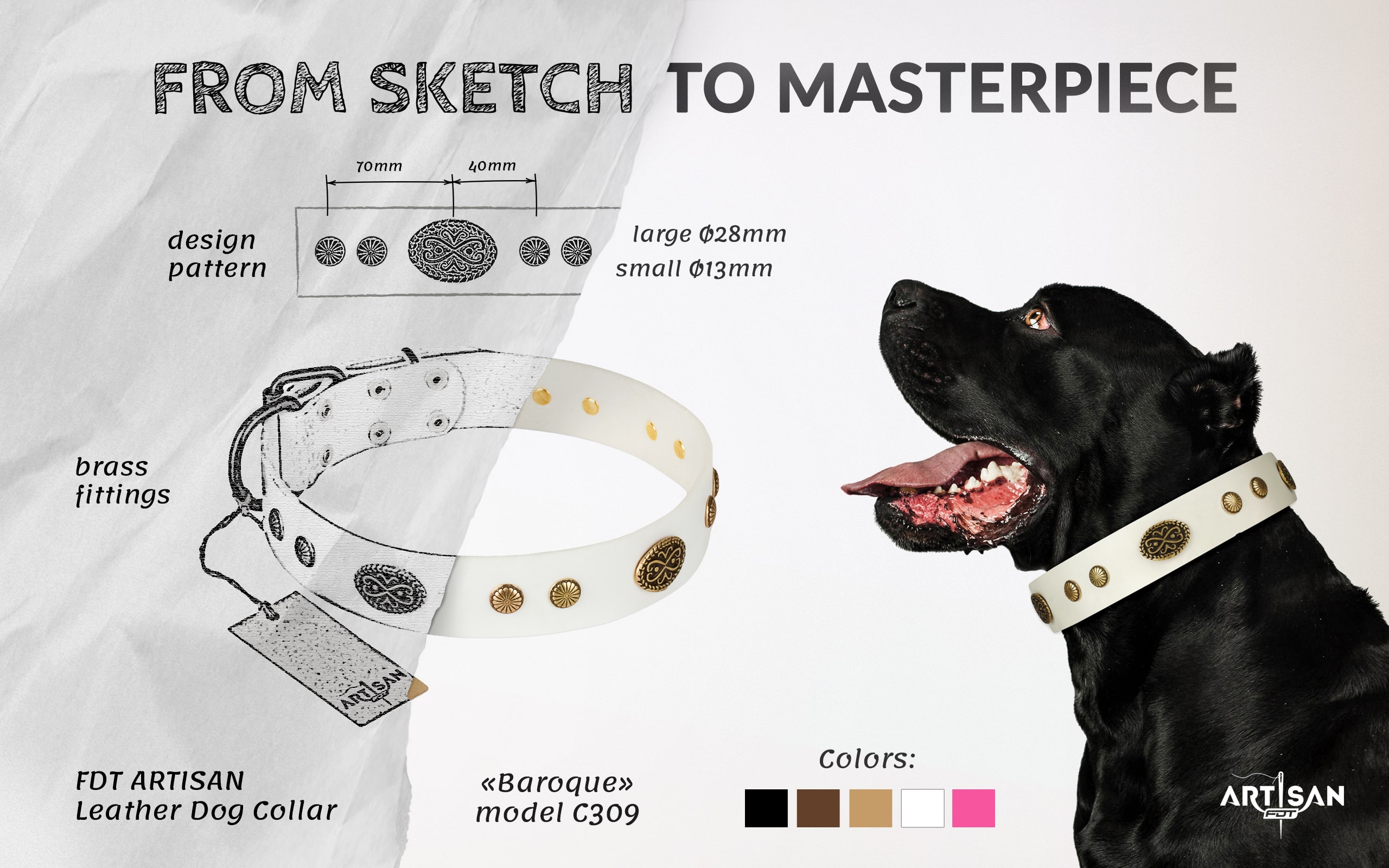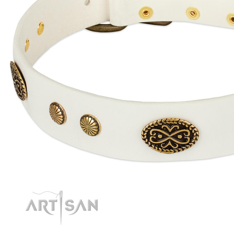 Baroque Style Decorated White Leather Dog Collar with Brass Plated Hardware