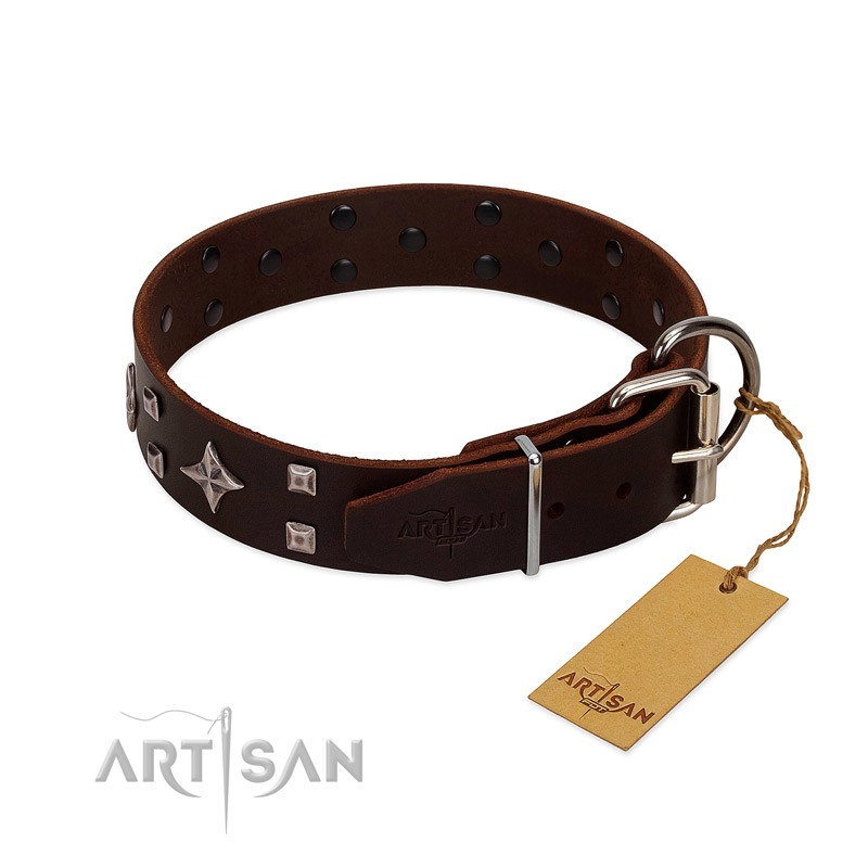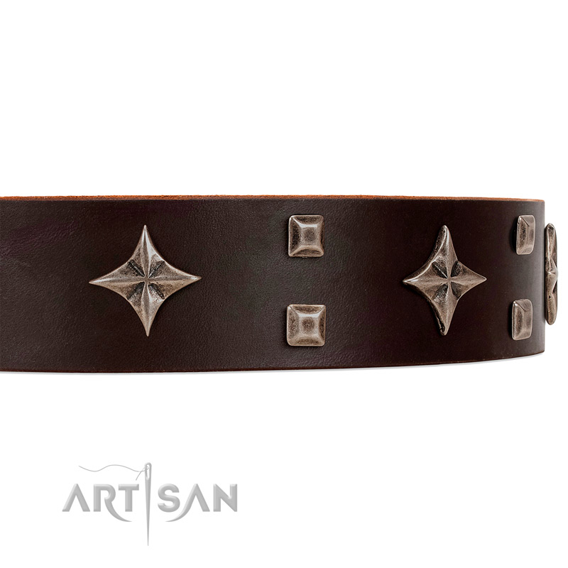 Modish FDT Artisan brown leather dog collar with silver-like stars and studs