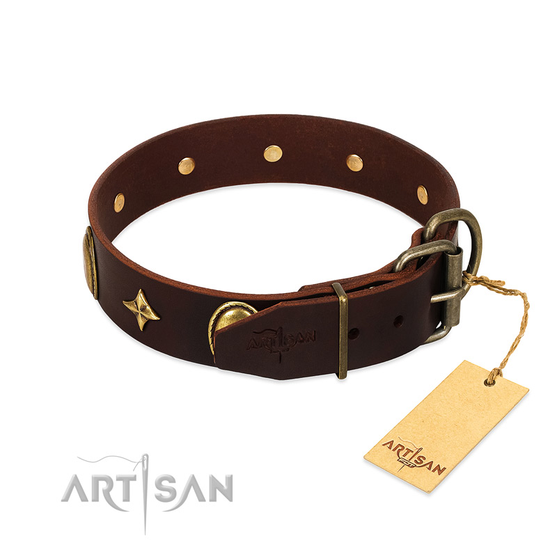 Model: C499#1073 Stylish FDT Artisan Brown Leather Dog Collar with Ovals and Stars