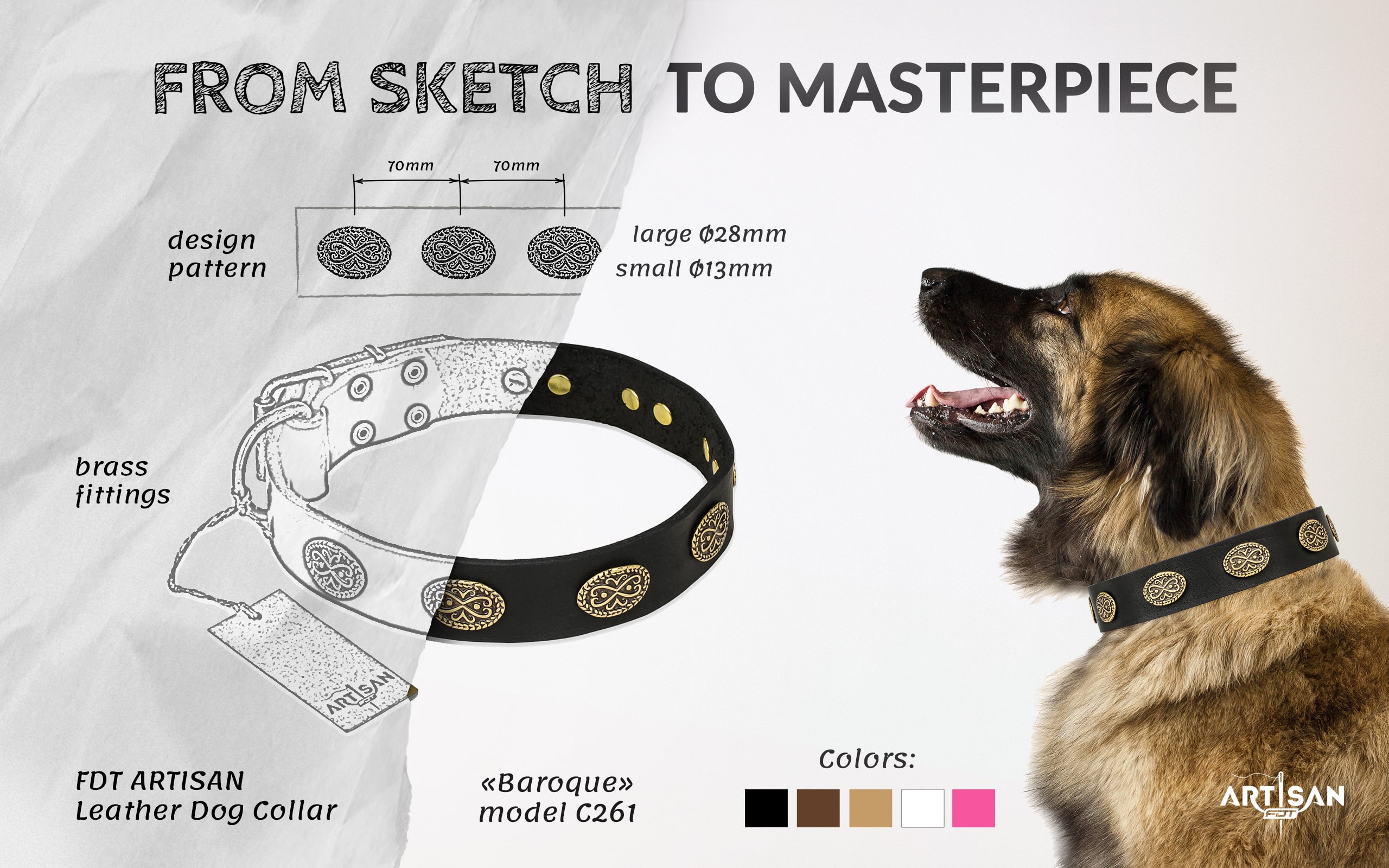 Brass buckle securely fastens the collar on the neck. It prevents occasional unfastening and will not let your pet remove the collar with paws. If you connect a dog leash to the brass D-ring you will have optimal control over your pet. This collar can be duly fitted to a dog’s personal neck size because it has 5 adjustment holes. Strong leather and hardware support you in emergency situation and provide 100% secure handling.