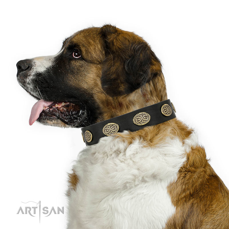 Baroque Style Decorated Black Leather Dog Collar with Brass Plated Hardware