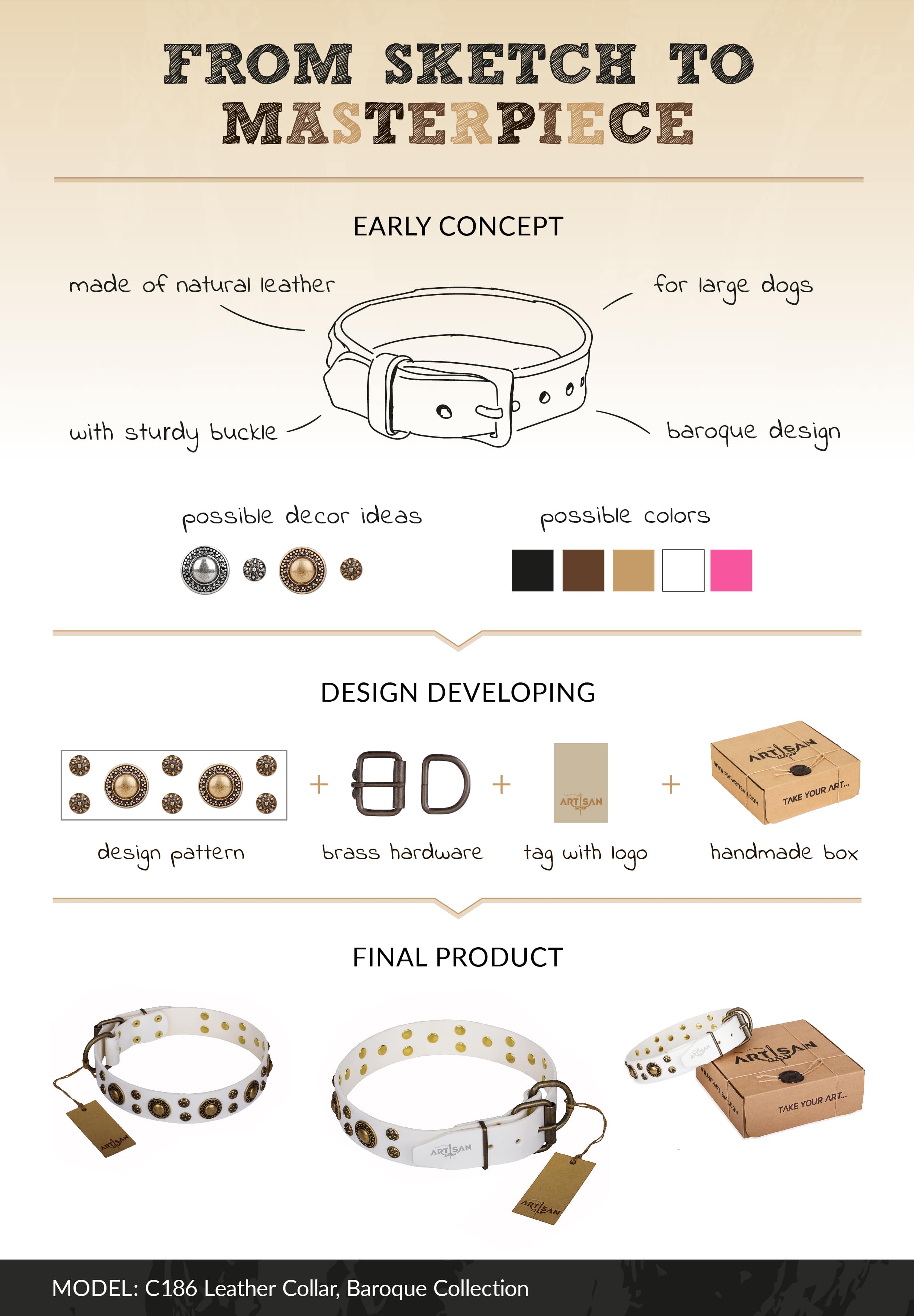 This collar is considered for daily routine pet activities. So, with this special accessory, your favorite doggy will be always in all his/her charm. White genuine leather of natural strength, old bronze-like plated hardware and decorations create a really stunning and unique collar for your beloved doggy.