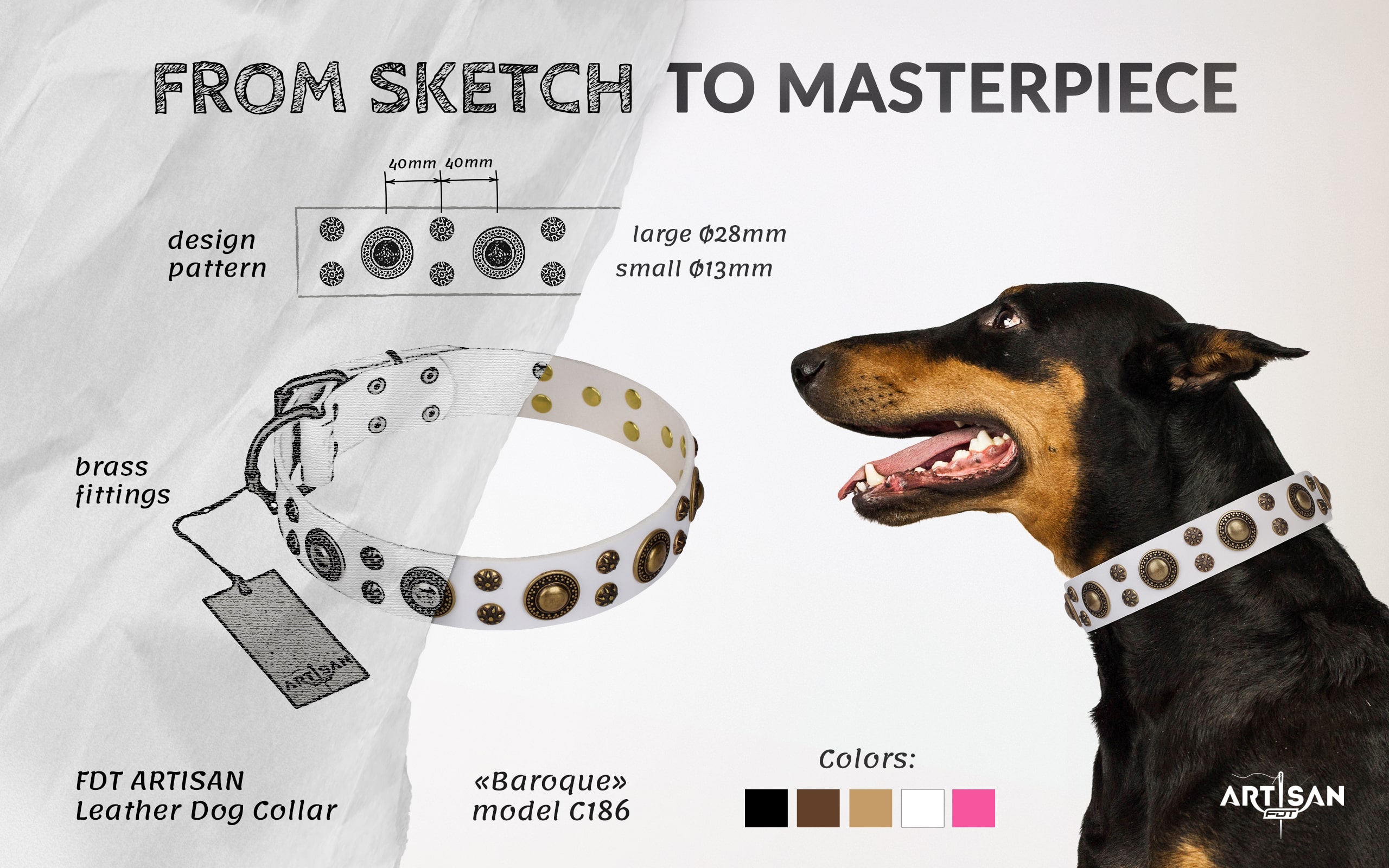 FDT Artisan Unique White Leather Dog Collar with Elaborate Decorations 1 1/2 inch (40 mm) wide