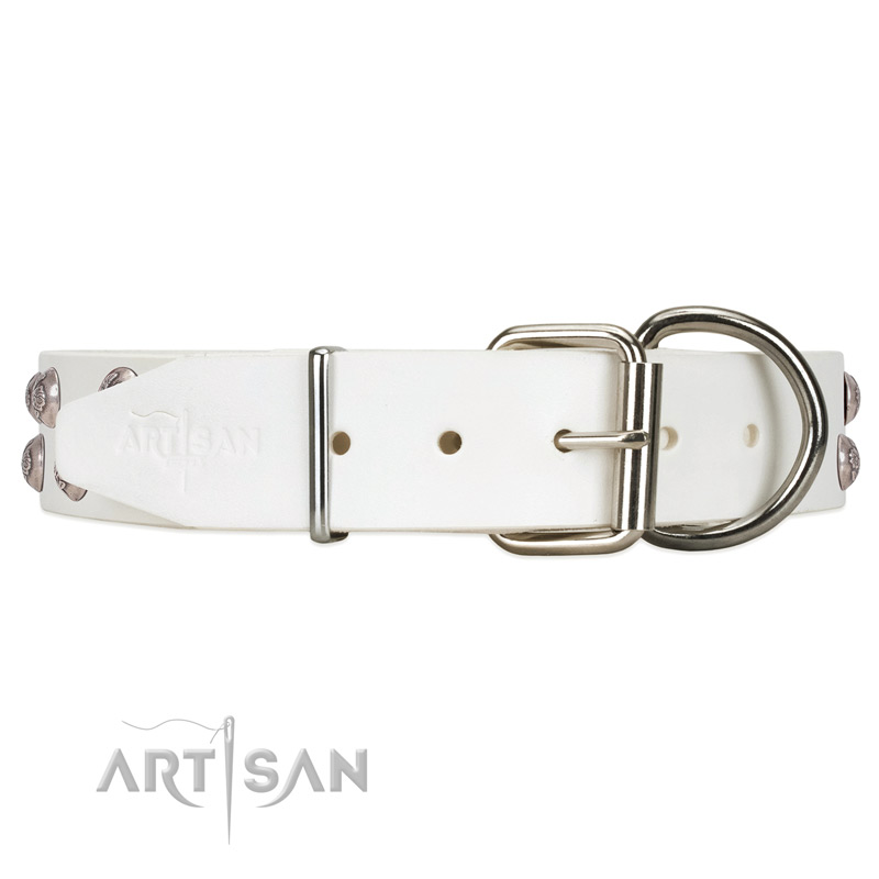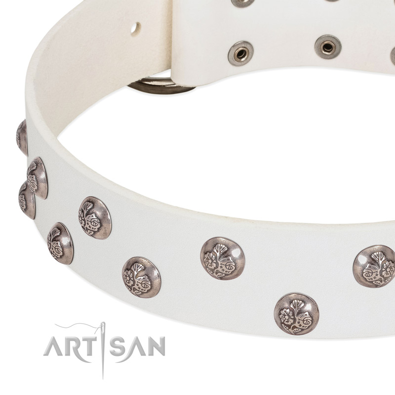 Are you looking for the accessory which combines matchless design, the finest quality and supreme comfort for your pet's daily activity? Such gear is not a myth! It exists! This white genuine leather dog collar decorated with chrome-plated engraved studs was designed by FDT Artisan to satisfy your highest demands. Your dog will have a