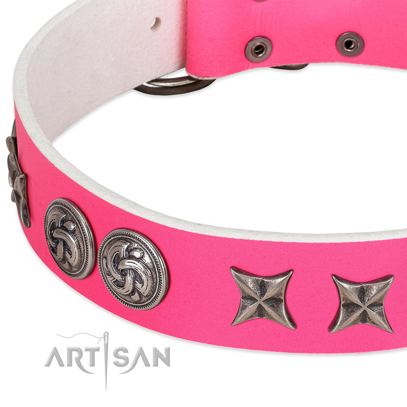 The design of the collar fascinates and astonishes. The silver-like decorations are a perfect match for the leather strap, that creates an impression of unveiled luxury. Stars and round shields with ornaments are installed along the collar and securely riveted to stay there almost forever. And what about the color? Pink matches lady dogs perfectly, don't you think so? Thus, it is one more advantage of this collar to consider when choosing a collar for your pet.