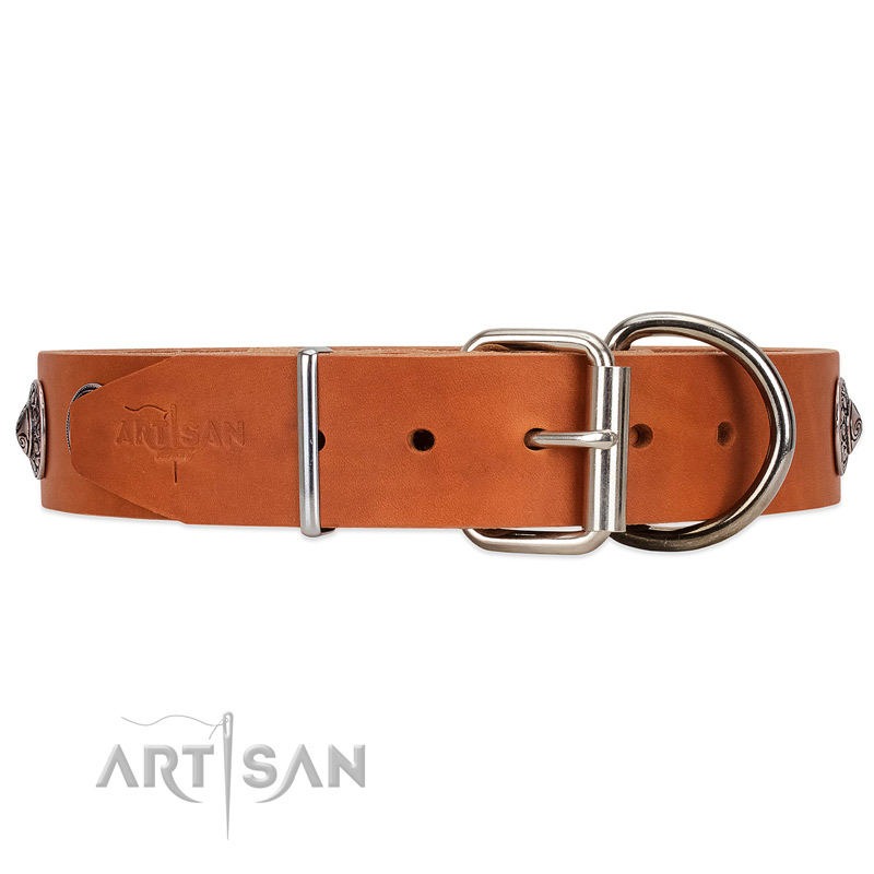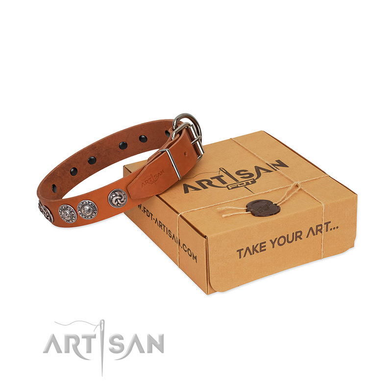 Decorated tan leather dog collar of dog-safe materials