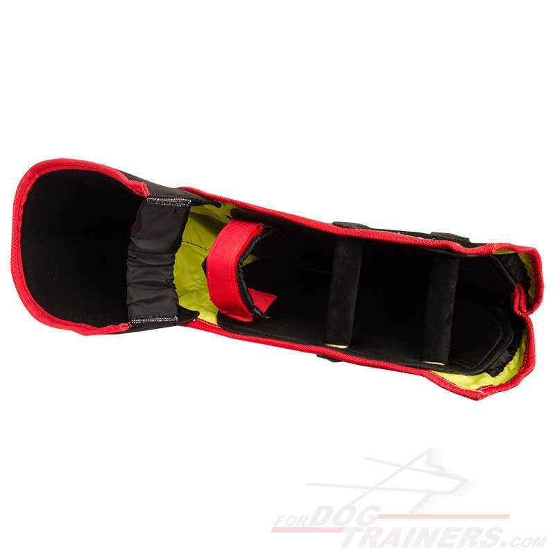The Sleeve has two handles inside. They allow to hold the sleeve stronger and hide the hand, protecting it from biting. Additional comfort is guaranteed due to its rather light weight (if compared to other bite sleeves) - only 3 1/3 lb (1,5 kg). However, please be attentive - this sleeve is short so it doesn't have shoulder protection and requires being more careful when training a dog. Special adjustable strap on the elbow zone allows to fit the sleeve in the most comfortable way for the helper. It fixates the sleeve well preventing it from moving around.