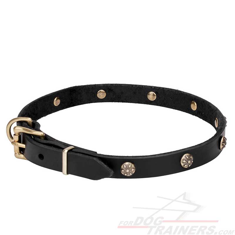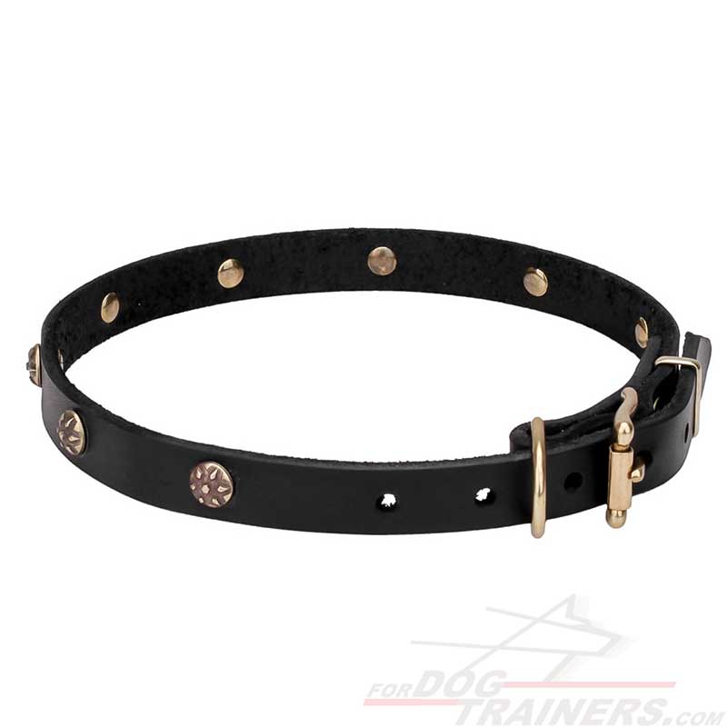 One more remarkable feature of this dog collar is its bright decoration. The item is adorned with 1 row of brass round studs with engraved flowers. Each stud is secured with small rivet to hold for a long time. Thus, you and your pet will enjoy its bright appearance for ages. The gold-like studs look great on black, brown and even tan color of the collar. You are welcome to choose any color to your taste.