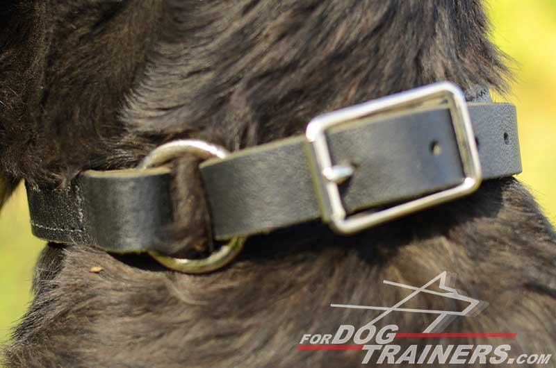 This Choke Collar has one outstanding peculiarity, that is a real godfind for owner, who doesn't want to spend money for many collars suitable for different activities. The Choke Collar is equipped with buckle. This may seem to be strange, because usually Choke Collars don't have it. What is the buckle used for? Due to it, you may easily turn Training Choke Collar into Ordinary Walking one! Unbuckle the leather strap and put it through one of the rings, while another one should move freely on the strap. Done? Now your dog is wearing Elegant Leather Collar without choking effect.