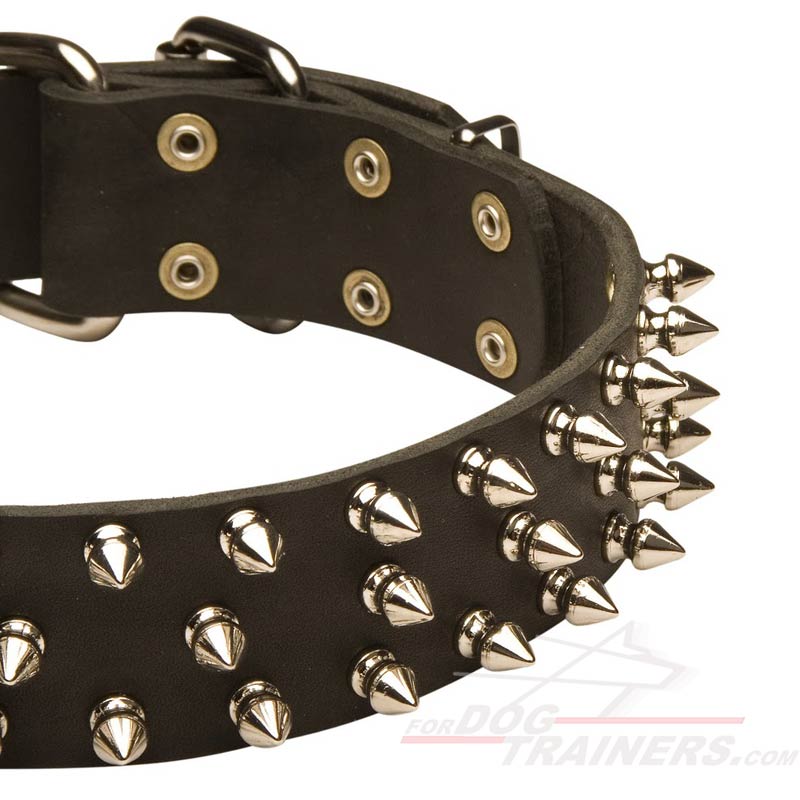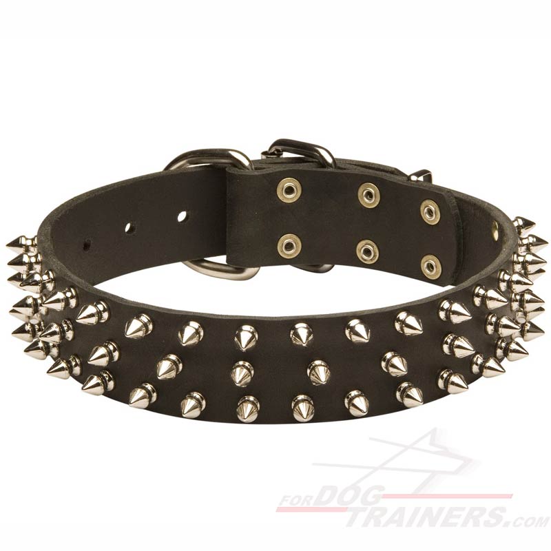 | Key features of this Dog Collar: - 3 rows of symmetrical proportional spikes