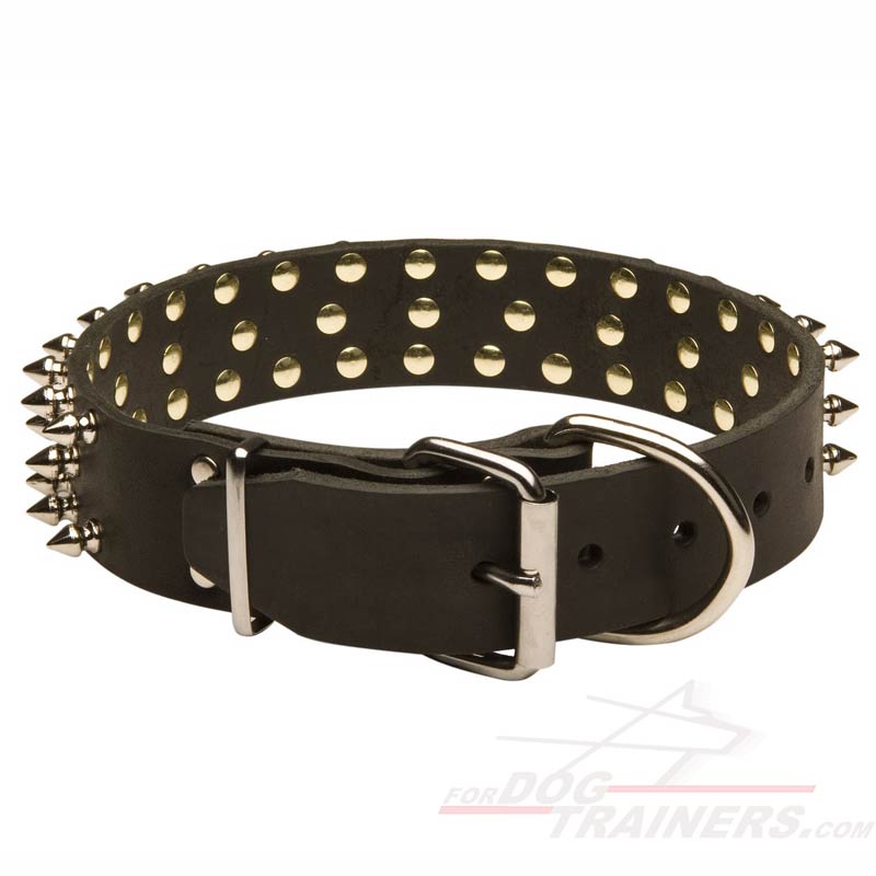 Dear dog owner, we are happy to offer you this Perfect Spiked Leather Collar. Three rows of spikes make your dog look dangerous. If your dog belongs to large breed, it will accentuate his strength. If your pet isn't big-sized, it will show, that you have style and the dog is very courageous. With this Collar you get high-quality equipment for affordable price. Get it today and make your dog look like a gladiator!