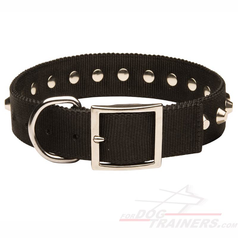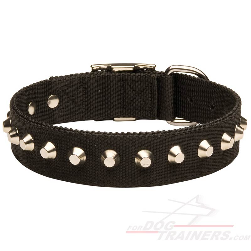This Nylon Collar is made with symmetrical proportional Nickel Pyramids. It is done to add stylish look to simple design of the Collar. Besides, pyramids are hand set with nickel rivets to hold forever. This Nylon Collar looks perfect on dogs of different breeds and sizes.