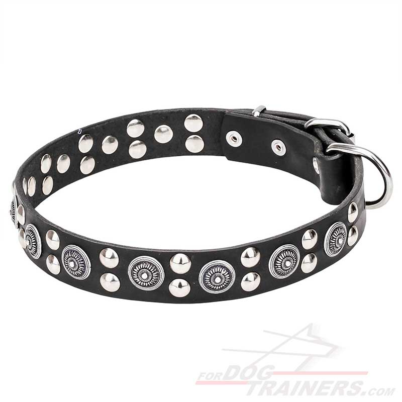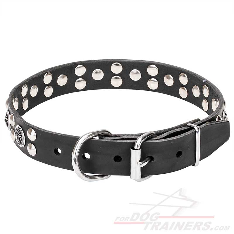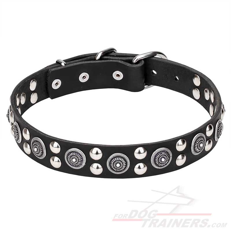 Do you like a variety? Don't you want to diversify even your dog's style? Of course, you want! Try this lovely decorated Leather Dog Collar with attractive round plates and studs! This item is a perfect combination of unique style and high quality. Wearing this collar on, your canine will look awesome. Besides, the collar is produced of specially oiled full grain genuine leather that ensures the long-lasting service of the gear. Hurry up to purchase this fantastic dog supply! Don't you think, this is the best variant for your four-legged friend?